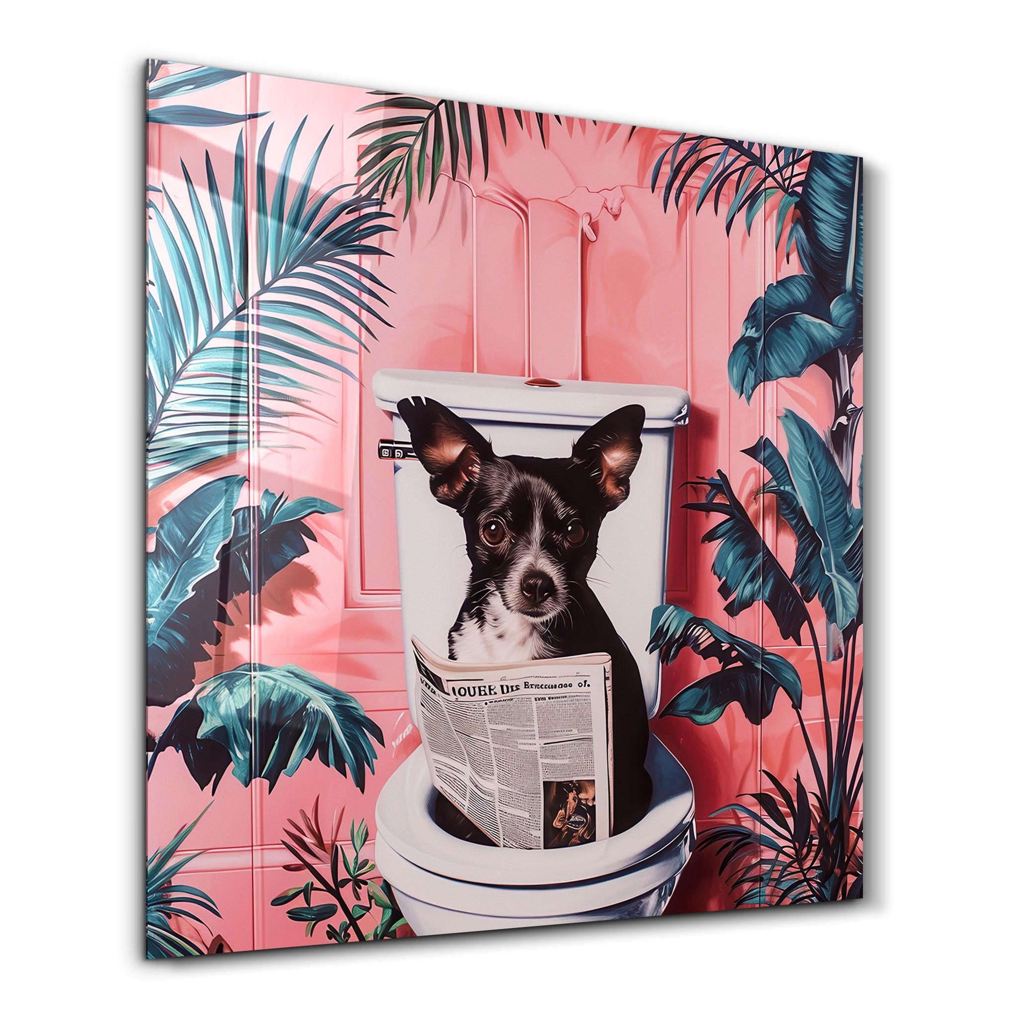 Keywords: funny glass wall art, tropical wall décor, humorous dog art, vibrant bathroom décor, unique glass wall art.