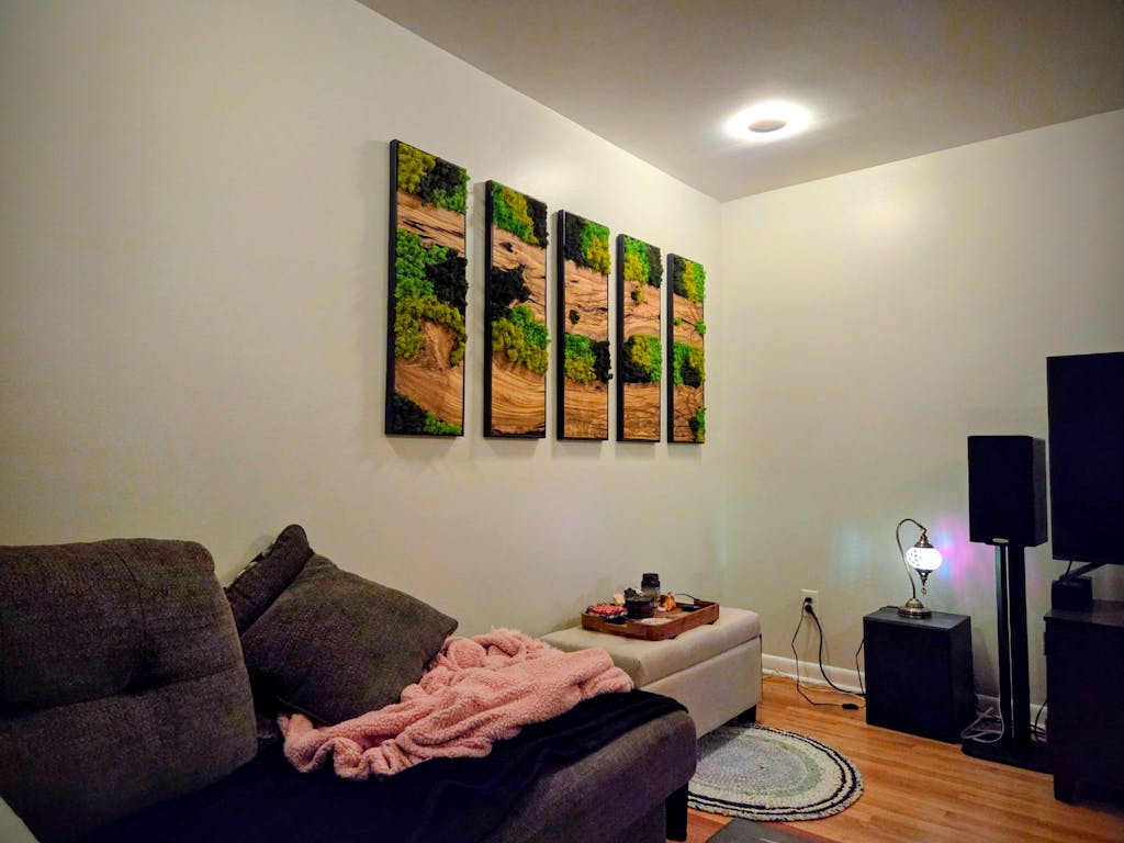 The Moss Forest is wonderful, very bright and elegant. I love it! It's a shame about the strong chemical smell from the moss; I hope it goes away quickly. Also, the hooks for hanging the panels on the wall weren't all mounted at the same height, so I had to rearrange some of them to get all the panels aligned.