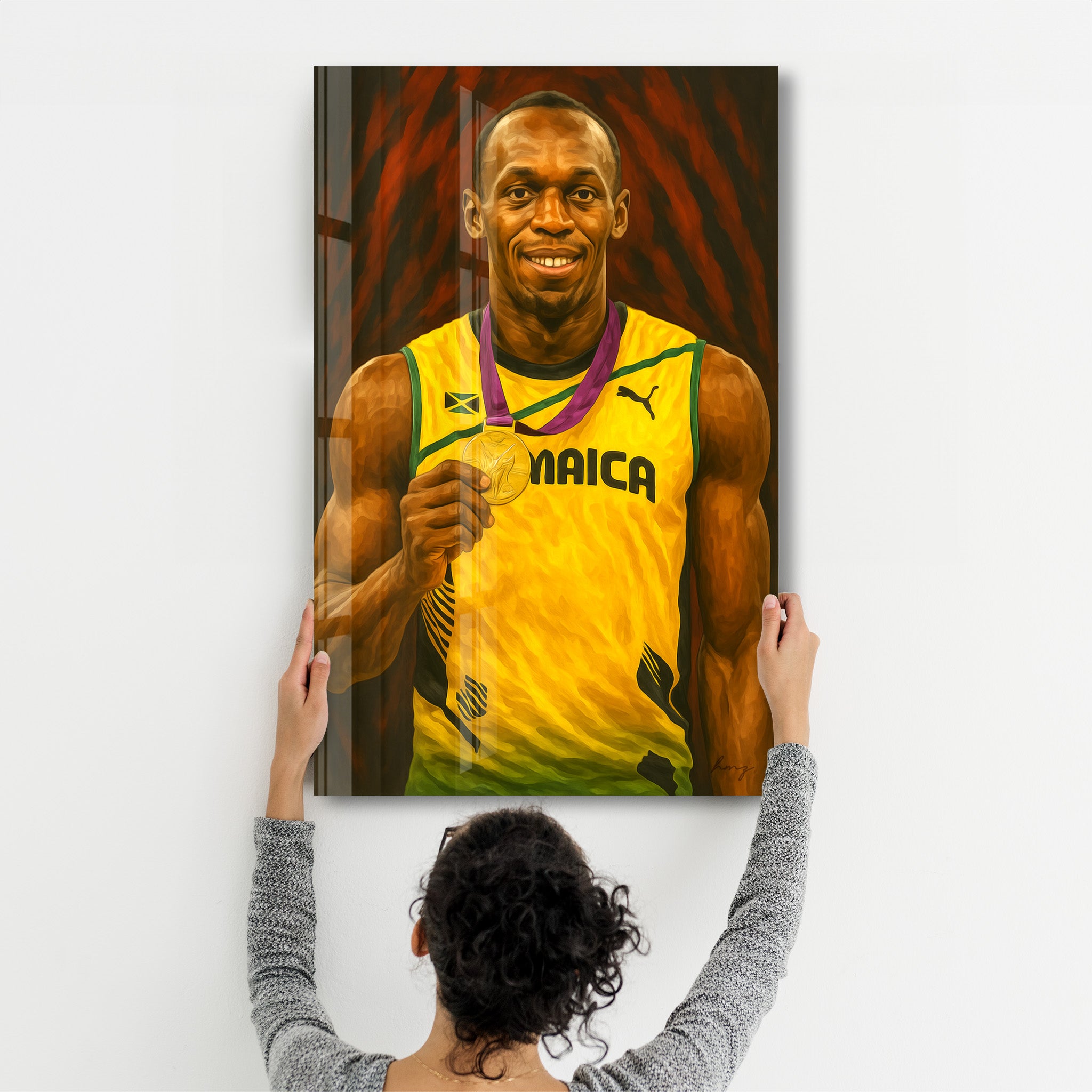 Celebrate the fastest man in history with The Lightning, a dynamic glass wall art piece that captures the pride, power, and charisma of an athlete who shattered records and expectations. Holding his gold medal with a signature smile, this moment immortalizes the legend in a bold, hand-painted style.
